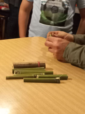 Wer es musikalischer mochte, erhielt von Marcel fachkundige Unterstützung beim Bau einer eigenen Flöte aus kleinen Ästen oder Bambus. Jan tüftelte besonders ausdauernd an seinem Instrument und brachte schließlich panflötenähnliche Töne hervor.