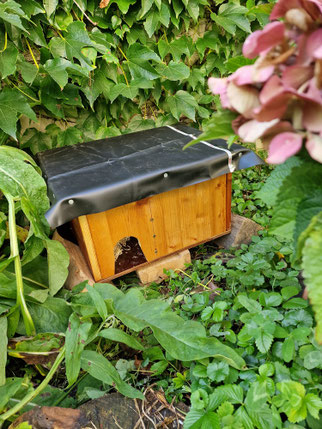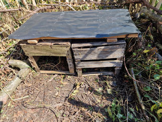 In diesem Jahr habe ich ihm deshalb eine neue Unterkunft gebaut: aus alten Holzkisten, mit einem Dach aus Teichfolie, das ihn vor Regen schützt. Wenn im Herbst genug Laub fällt, kann er sich darin sein ganz persönliches, kuscheliges Winterquartier einrichten.