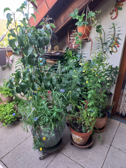 Mittlerweile habe ich einen festen Bestand an robusten Stauden, die ich im Frühjahr sogar ausdünnen muss. Die geteilten Pflanzen werden dann in andere Kübel gepflanzt oder finden im NABU-Garten ein neues Zuhause. Einige Pflanzen, wie z. B ein mittlerweile groß gewordener Kaffeebaum und ein kleiner Olivenbaum, gehören zu den wenigen Exoten, die ich auf unserem Balkon stehen habe.
