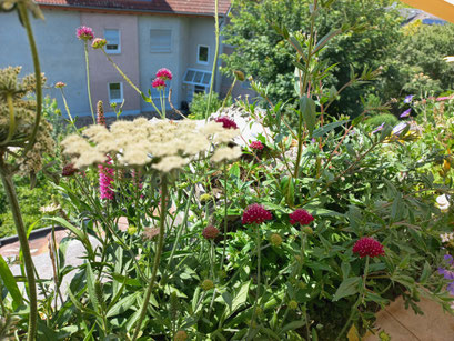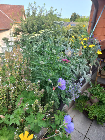 Früher standen dort vor allem klassische Saisonblumen. Heute wachsen in meinen Blumenkästen mit Bewässerungssystem und verschieden großen Tontöpfen mehrjährige, überwiegend heimische Stauden. Neue Pflanzen werden gesät oder gekauft: Über die Jahre habe ich gelernt, nicht jede Pflanze übersteht den Winter oder fühlt sich im Balkonkasten wohl.