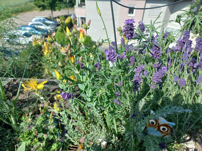 Insekten wie Erdhummeln, Schwebfliegen, Gemeine Wespe, Feldwespen, Wildbienen, Holzbienen, Taubenschwänzchen und hin und wieder ein Schmetterling besuchen in diesem Jahr vermehrt die Pflanzen.