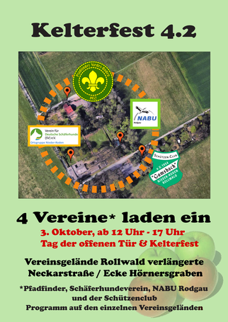 Großer Trubel herrschte am Tag der deutschen Einheit auf den Vereinsgeländen der vier am Rollwald beheimateten Vereinen Naturschutzbund Rodgau, Schützenverein Gamsbock, Verein für Deutsche Schäferhunde und Pfadfinder Nieder-Roden 1952 e.V. beim Kelterfest 4.2., das auch im dritten Jahr scheinbar nichts von seiner Faszination verloren hat. Zu Hunderten pilgerten die Besucher zu dem beliebten Ausflugsziel für die ganze Familie, um die bunte Vielfalt an Aktivitäten, Informationen, Mitmachgelegenheiten und nicht zuletzt die kulinarischen Leckereien zu genießen. „Es werden jedes Jahr mehr Leute, die den frisch gepressten Süßen und die außergewöhnlichen und bunten Veranstaltungen drumherum nicht verpassen wollen“, frohlockten die beiden Vorsitzenden des NABU Richard Wenzel und Gerlinde Rapp. „Wir sind jetzt schon an die Grenzen unserer Kräfte gestoßen und könnten die zahlreichen Arbeiten ohne Hilfe nicht vereinsgebundener Helfer und Helferinnen nicht mehr bewältigen. Und das, obwohl ein paar Schildbürger des Landkreises Offenbach mit ihrer riesigen Informationwand „Ein Glücksfall für den Kreis Offenbach“ unsere Einladungtafel zum Kelterfest im IGEMO-Ständer am Ortseingang von Nieder-Roden verdeckten“.