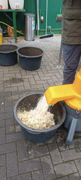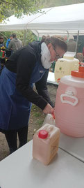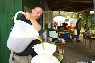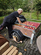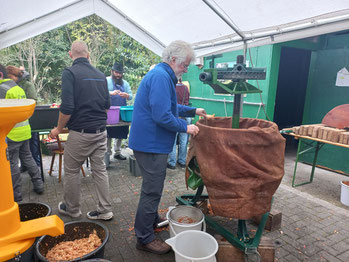 Beim Keltern hatten Manfred Eberhard und Rudolf Siebert den Hut auf. Zusätzlich brauchte es aber noch zahlreiche Helfer, ohne die diese aufwendige Arbeit nicht zu bewältigen gewesen wäre. Hier war große Ausdauer gefragt. Die Äpfel wurden zuerst in einem großen Bottich gewaschen, dann angeschaut und schadhafte Stellen herausgeschnitten. Waren genügend Körbe bereit, wurden die Äpfel geschreddert und in die Kelter geschüttet. Jetzt konnten die Holzklötze eingelegt werden und das manuelle Pressen begann. Der frische Süße wurde in Eimern aufgefangen und direkt zum Verkauf abgefüllt.