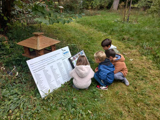 Kinder schauten sich mit großem Interesse die Schaukästen zu Waldbewohnern und heimischen Zugvögeln an.